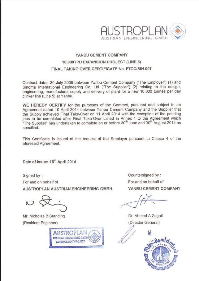 On April 15th, Saudi Arabia YCC 10000t/d project contracted By Sinoma (Nanjing) was awarded FTOC (Final Taking Over Certificate) by the employer and the consulting company, which signifies a successful completion of the project.
