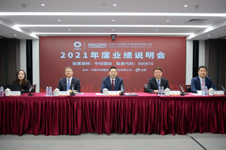 為便于廣大投資者更全面深入地了解中材國際基本情況、2021年度經營業績和戰略思路,3月28日下午,公司以視頻直播結合網絡互動的形式召開2021年度業績說明會。公司董事長、黨委書記劉燕,董事、總裁印志松(視頻參會),獨立董事周小明,副總裁隋同波,副總裁、財務總監汪源(視頻參會),副總裁何小龍(視頻參會),董事會秘書、總法律顧問范麗婷,中金公司董事總經理、中材國際獨立財務顧問郭允出席本次會議,與廣大投資者、分析師開展互動交流。