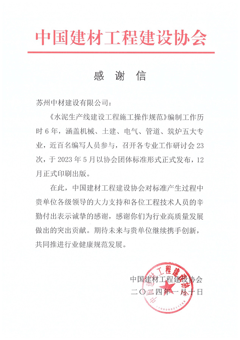 信中對公司在《水泥生產(chǎn)線建設(shè)工程施工操作規(guī)范》編制過程中的重要貢獻和各位工程技術(shù)人員的辛勤付出表示誠摯的感謝,并希望未來能夠繼續(xù)攜手推動行業(yè)高質(zhì)量發(fā)展。