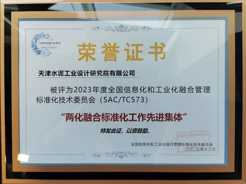 天津水泥院榮獲“2023年度兩化融合標準化工作先進集體”榮譽稱號